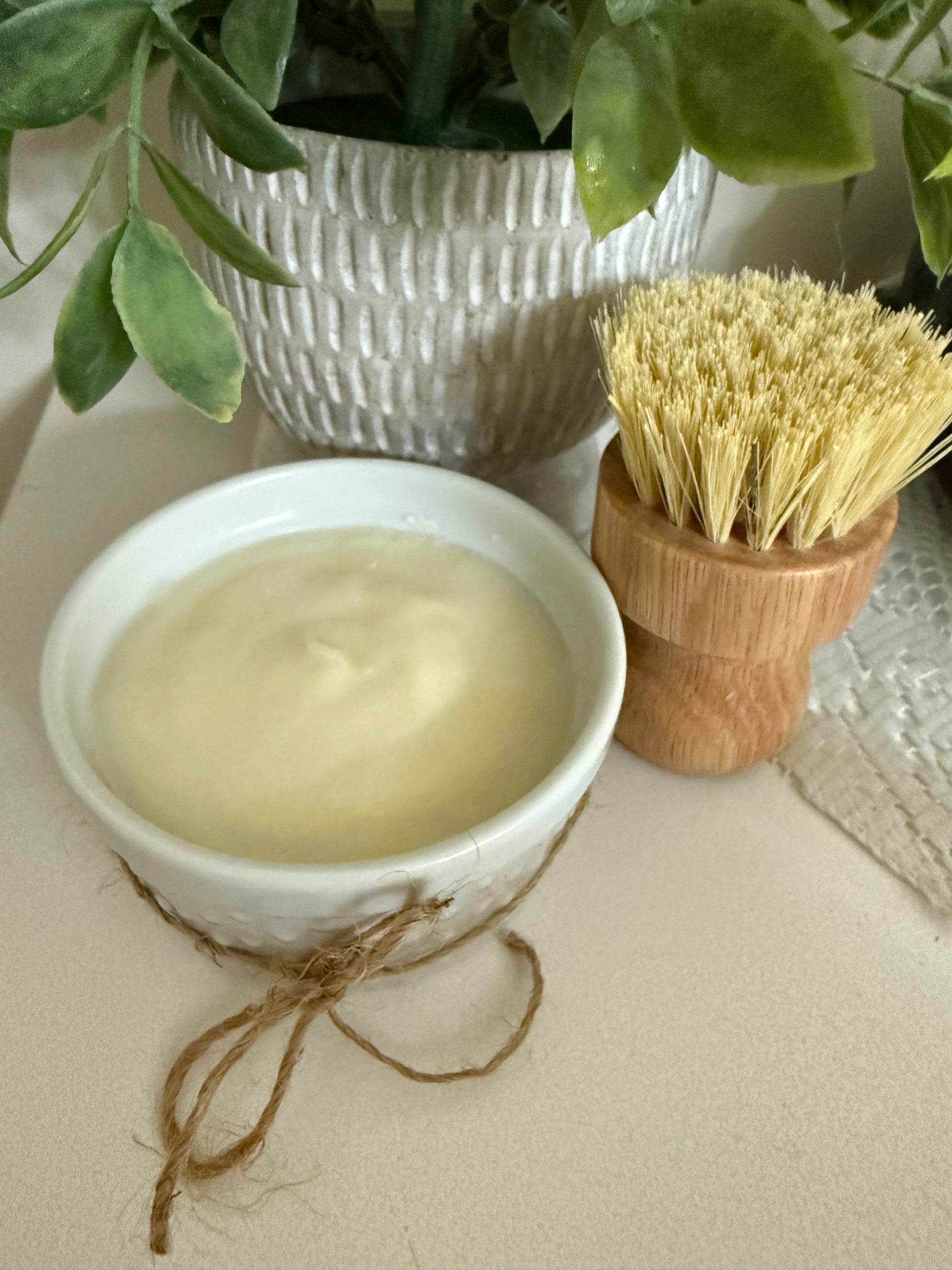 All natural vegan cold press dish soap scented with lemon essential oil. 4 oz soap bar. Comes with a dish brush and reusable ramekin