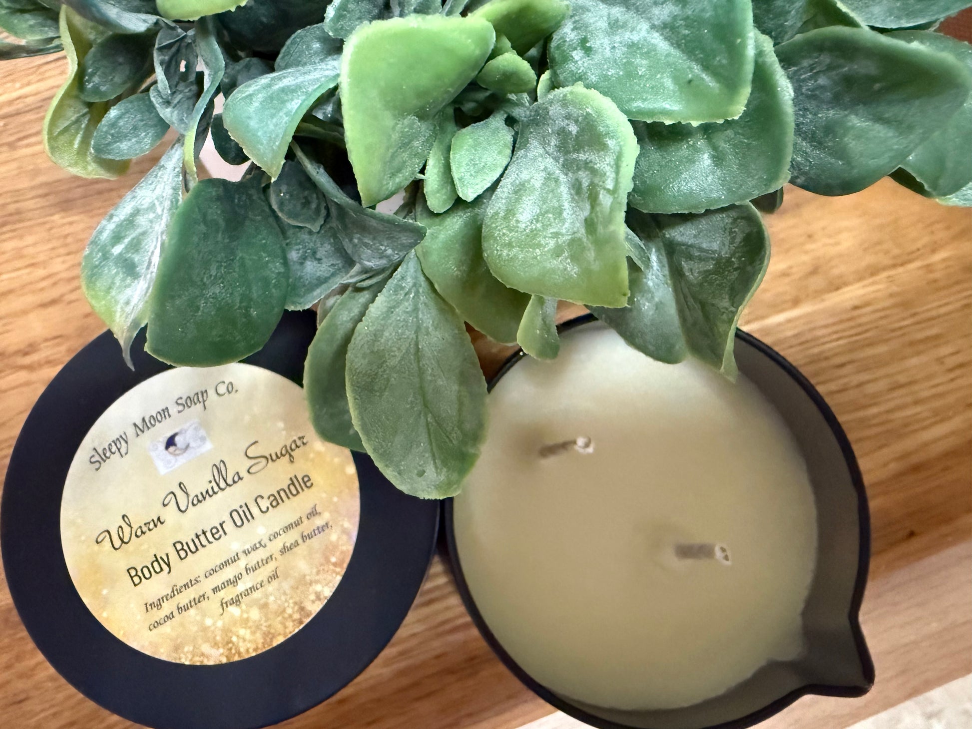 4 oz tin with spout loaded with all natural nourishing ingredients like cocoa butter, Shea butter, coconut wax, coconut oil, and mango butter and scented with Warm Vanilla Sugar.