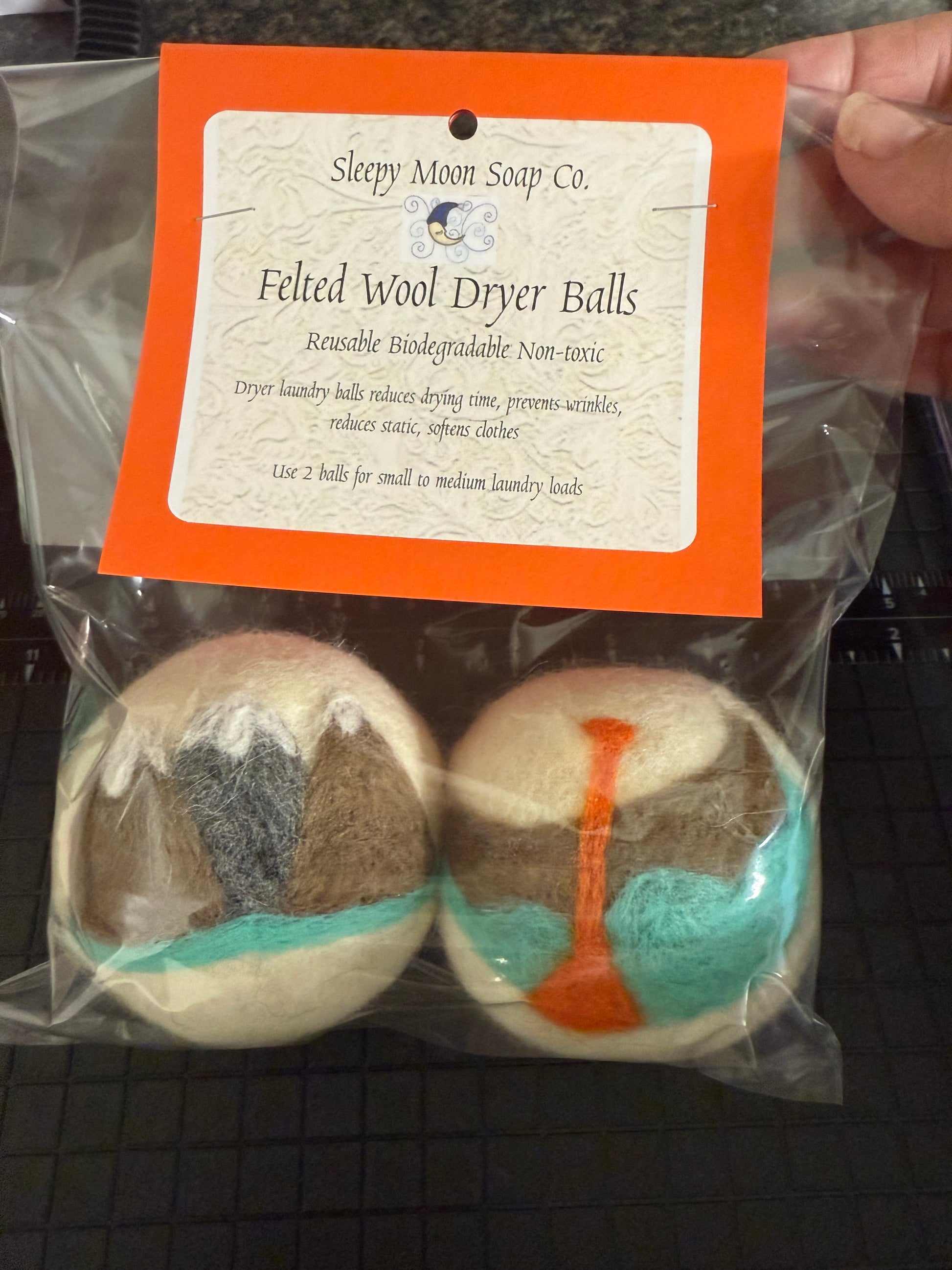 2 Pack of large wool laundry dryer balls with an artwork hand needle felted on each. Use 1-2 balls for medium to large loads to reduce drying time, reduce wrinkles, and soften clothes. Wool dryer balls are reusable, all natural, biodegradable, chemical free and fragrance free