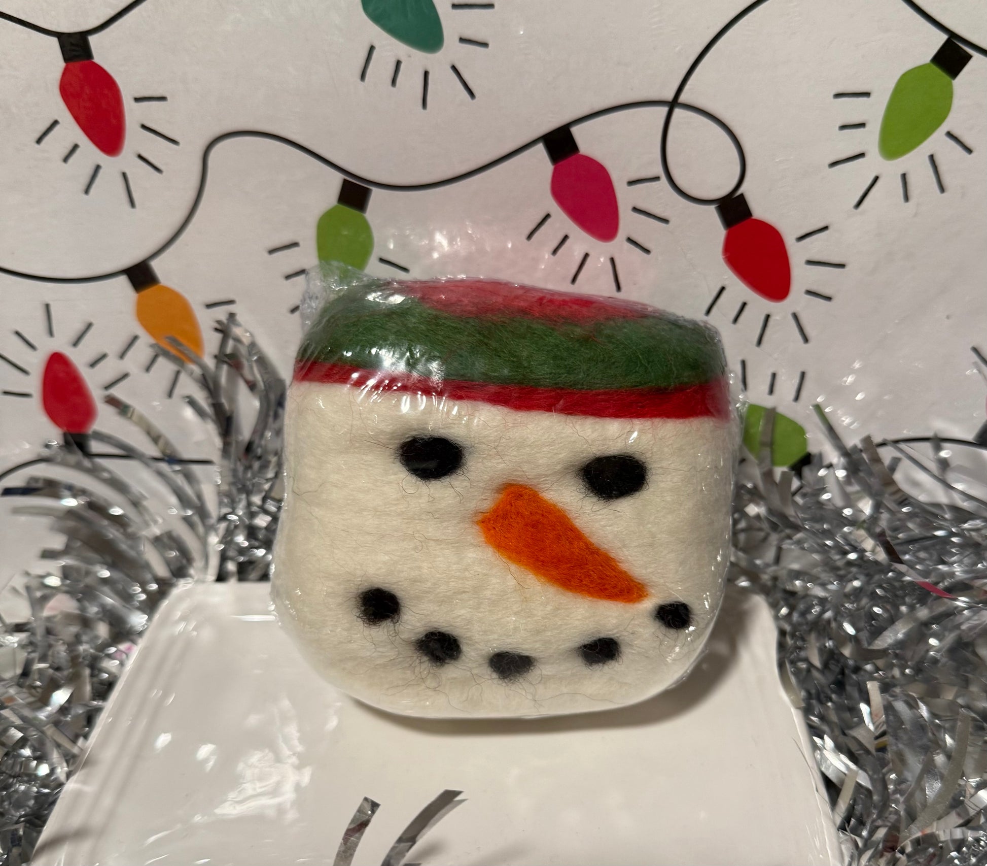 All natural plant based soap bar made in small batches wrapped in wool to create a washcloth with a hand needle felted design on the soap