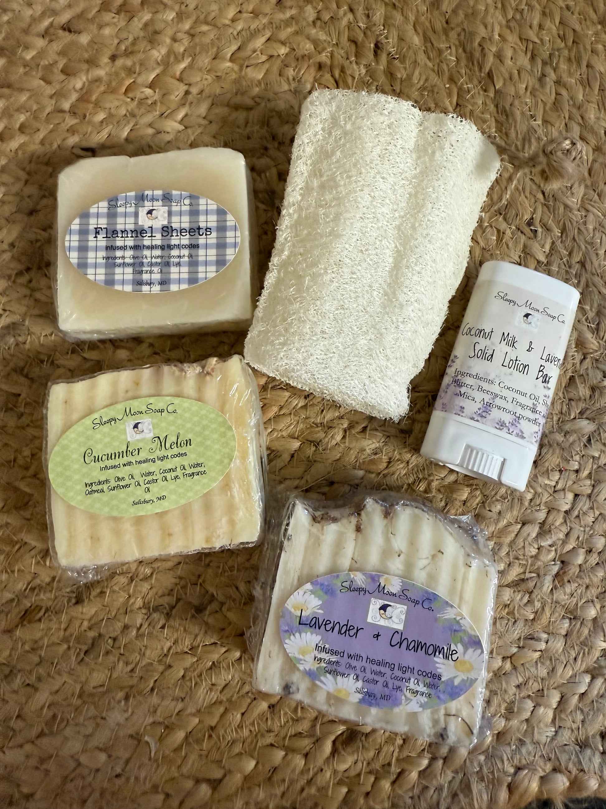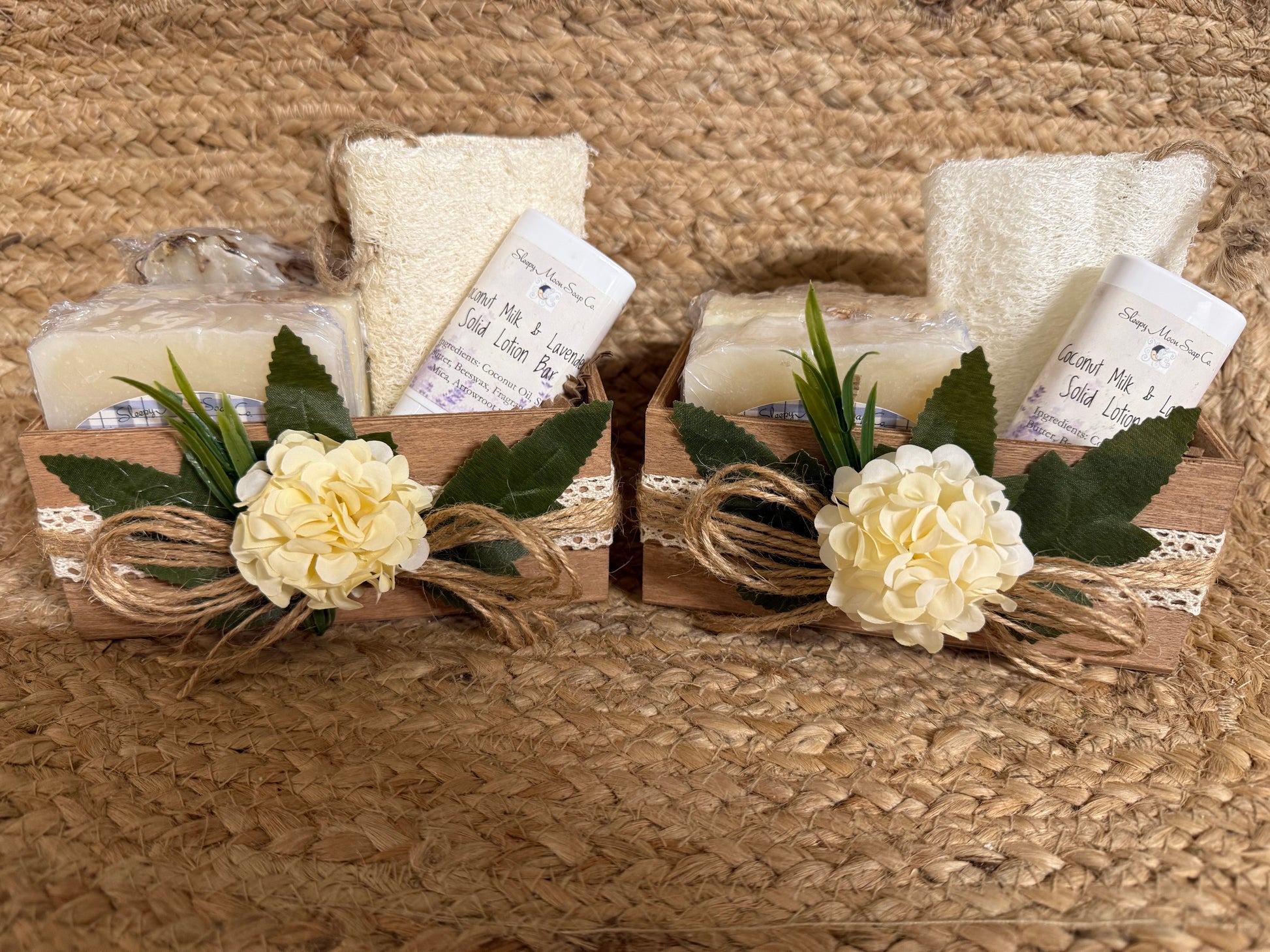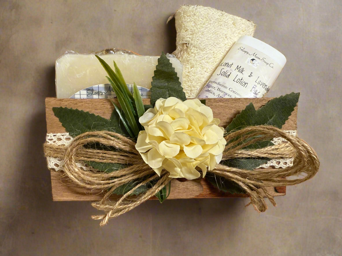 Rustic wood crate filled with three of our classic vegan soaps; cucumber melon, flannel sheets and lavender chamomile along with our lotion stick coconut milk and lavender and a loofah.